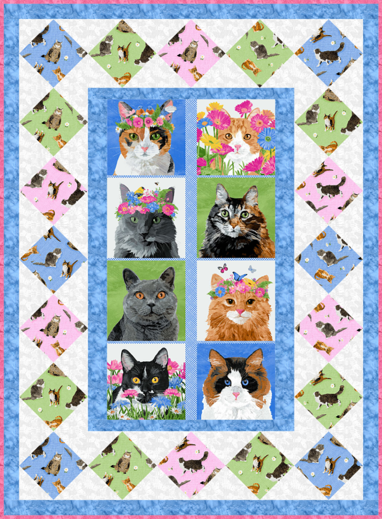 The fresh happy colors in this 50″ x 68″ quilt design will cheer up any room, or will thrill your favorite Ailurophile (Cat Lover).