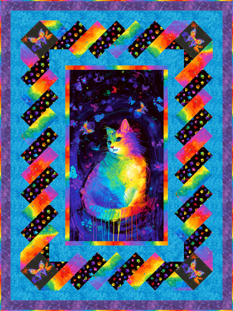 This 55″ x 72″ quilt design makes a large lap quilt that evokes the comfort of the Rainbow Bridge, or an uplifting wall hanging for your Kitty Room. For the young cat lover, this would also make a delightful coverlet for a youth bed.