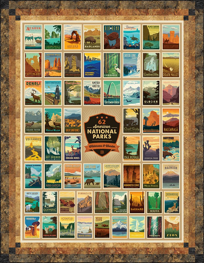 To make this 63″ x 80″ quilt design, you will start with the amazing 54″ x 72″ digital-printed panel. (With 62 National Park posters.) This quick and easy quilt design uses 3 colors of Stonehenge textures to create the border. The central panel can be treated like a ‘cheater panel’ – i.e. you can stitch around the park posters as you would stitch around blocks on a cheater quilt panel.