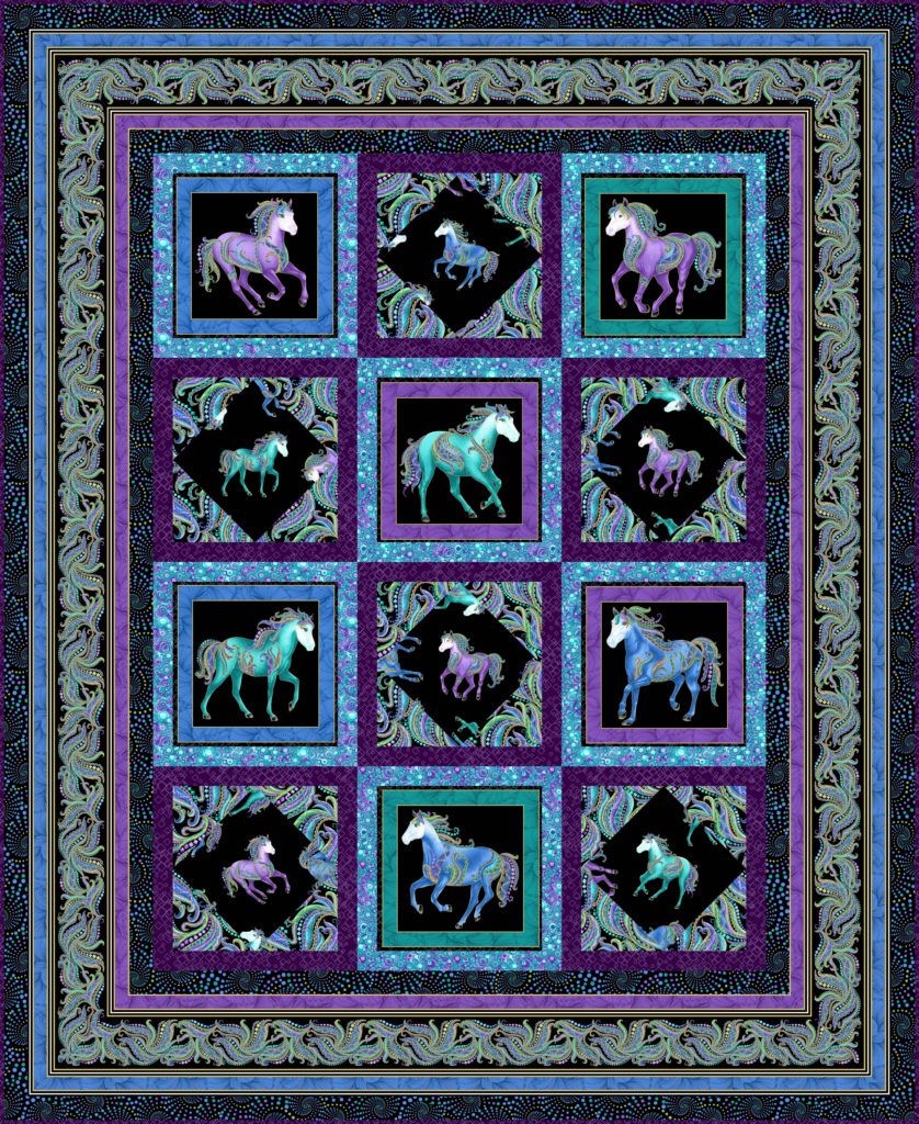 This generous 58″ x 72″ quilt design combines her Horse panel and Horse allover, with a swirly golden stripe and lots of luscious coordinates. You’ll be carried away by this fabulous group of equine fabric designs!