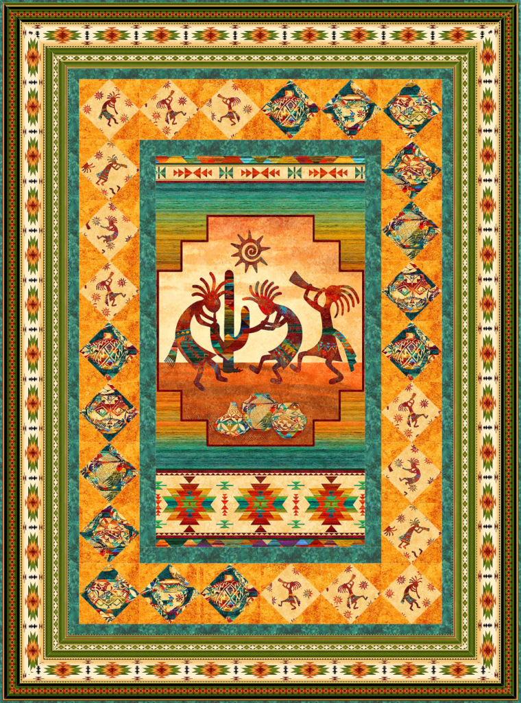 The rich Southwest colors of Terra Cotta, Turquoise, Cactus Green are also found in the pottery and Navajo rug patterns of this 56″ x 75″ quilt design. The geometric stripe is used to make the clever border. The last time we had this panel in stock it blew out, so we want to make sure you have another chance to dance with Kokopelli now that he is back in stock.