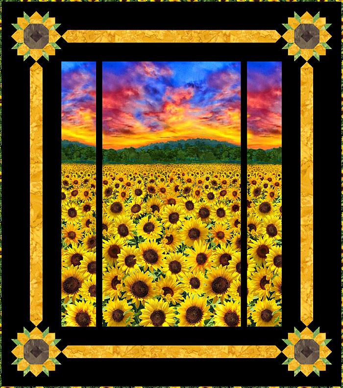 To make this 55″ x 62″ eQuilter exclusive quilt design, you will start with the 24″ x 44″ scenic Sunflower Field panel. Piece the Sunflower Stars in each corner, with Hoffman Hand-Dyes. As an option, you can re-color this this quilt with a Ukrainian Blue solid or hand-dye in the border instead of the solid black.