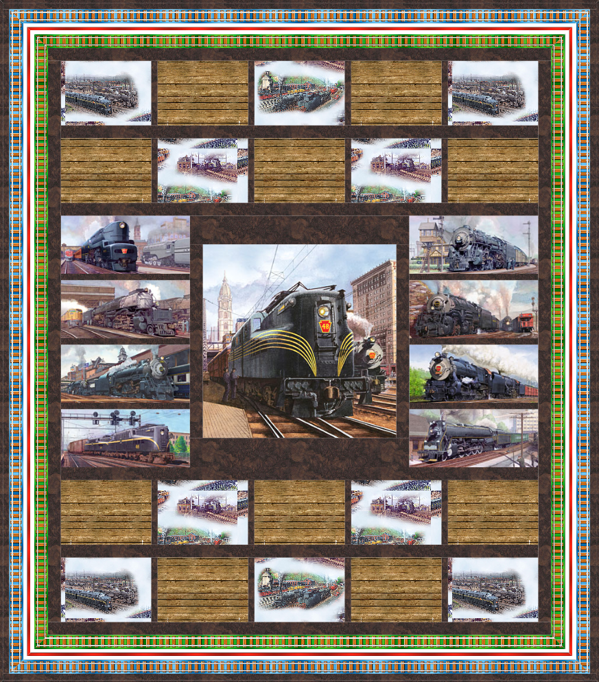 Train vignettes alternate with wood paneling, set off with a Hoffman hand-dyed sashing. The clever border is made out of a colorful train track design, picking up on the bright accents in the train collection.