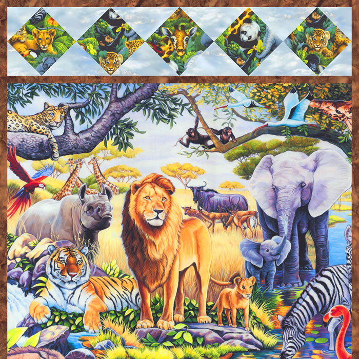 This week’s exclusive eQuilter Free Quilt Pattern features this incredible digital panel with a peaceful gathering of endangered species. Wildlife lovers will appreciate this beautiful detailed artwork, which we’ve framed with animal vignettes set on point, and more animal portraits set in corner blocks. And young children will enjoy finding & naming their favorite wildlife friends.