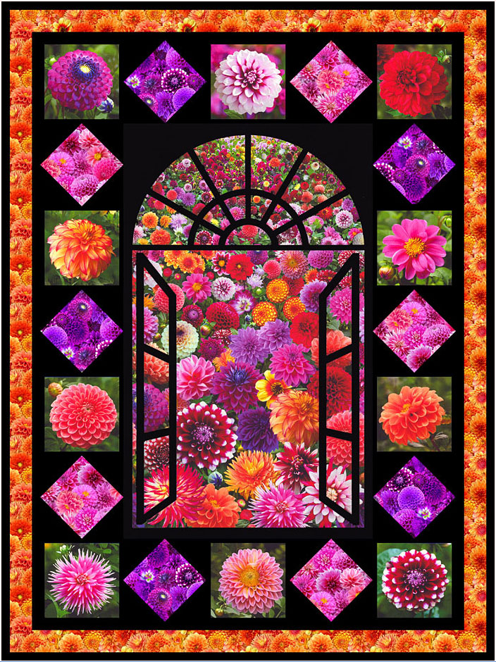 The window seems to be opening, beckoning you to take a walk in this exquisitely detailed garden that stretches into the distance. Flower vignettes are set into the black border, giving the impression of stained glass windows. Take a deep breath – you can almost smell this dense field of blossoms. If you are a Dahlia fan, this wall hanging is just sheer heaven, don’t you think?