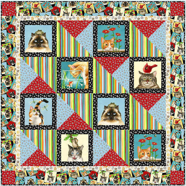 Bright stripes and pawprint coordinates frame the Kitty Blocks, with a fun border of tossed Cat Snapshots. This 44.5″ x 44.5″ quilt can be a wallhanging, playmat or baby quilt.