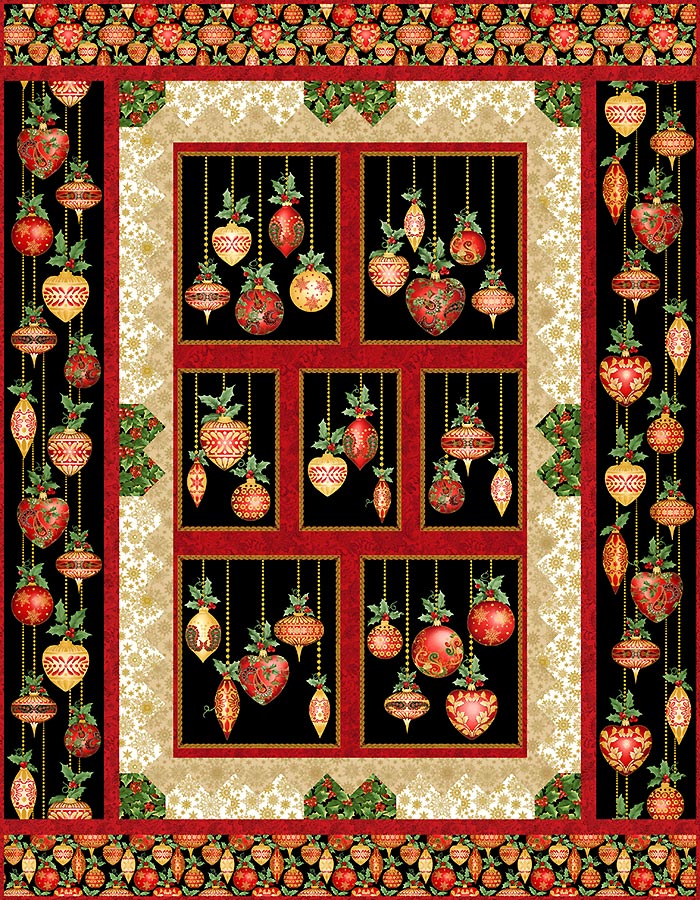 Start with a central panel featuring large-scale detailed birds or ornaments, add a pieced Inner Border, then add the larger outer border with more birds or ornaments. The Red and Gold Metallics really “pop” on the Black and Ivory backgrounds…perfect for a festive room full of holiday decorations.