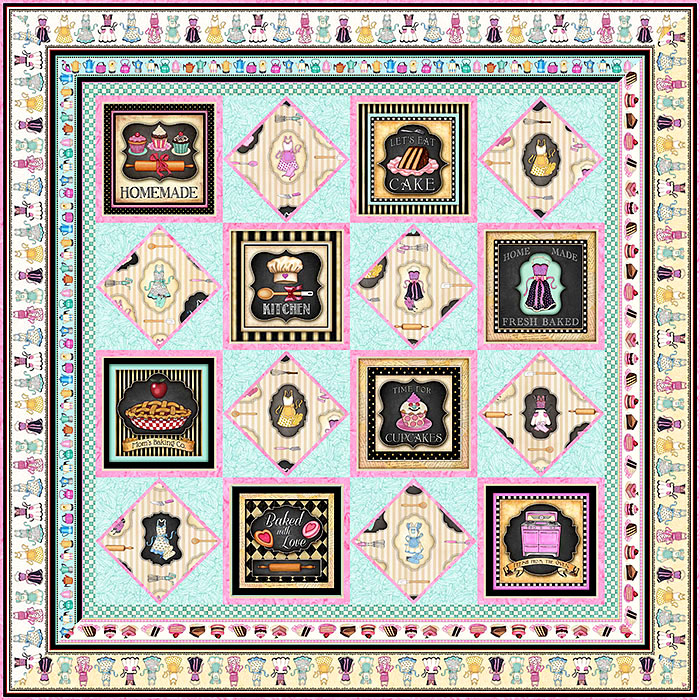 This charming 55″ x 55″ quilt features Aprons, Cherry Pie, Rolling Pins, an old-fashioned enamel stove, Cupcakes, a slice of Chocolate Cake, Wooden Spoons, and other delightful details that will take you right back to that moment licking the spoon sitting on a high stool at Nana’s kitchen counter.