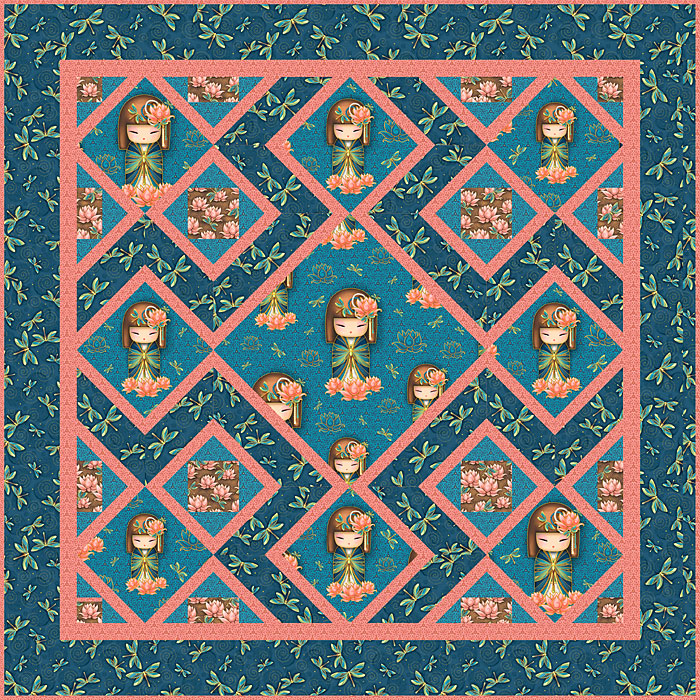 This quilt design uses a clever Asian geometric design, setting dolls and dragonflies on point, contrasting shades of Teal and Indigo, against Rose-hued sashing.
