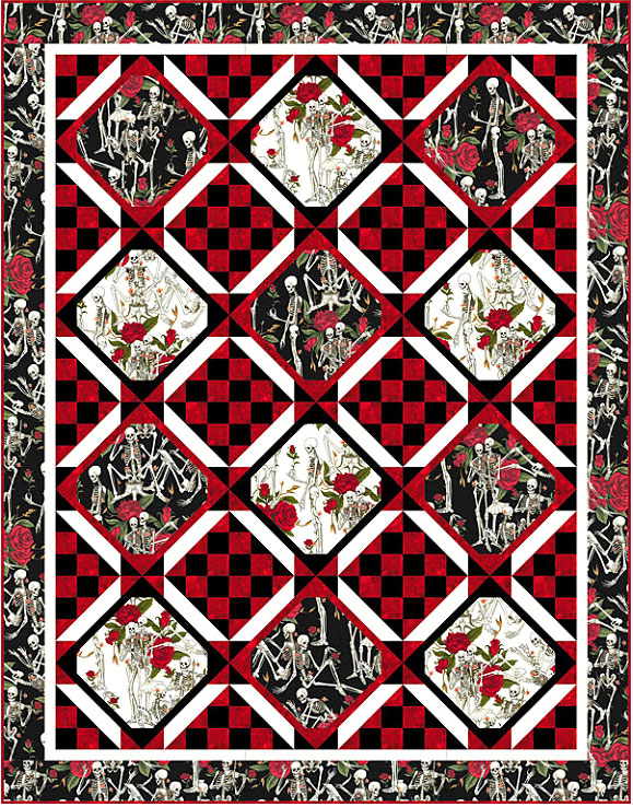 Whether you collect Day of the Dead, Halloween, Steampunk or Grateful Dead fabrics, this black and red checkerboard quilt design lends itself to many different possibilities.