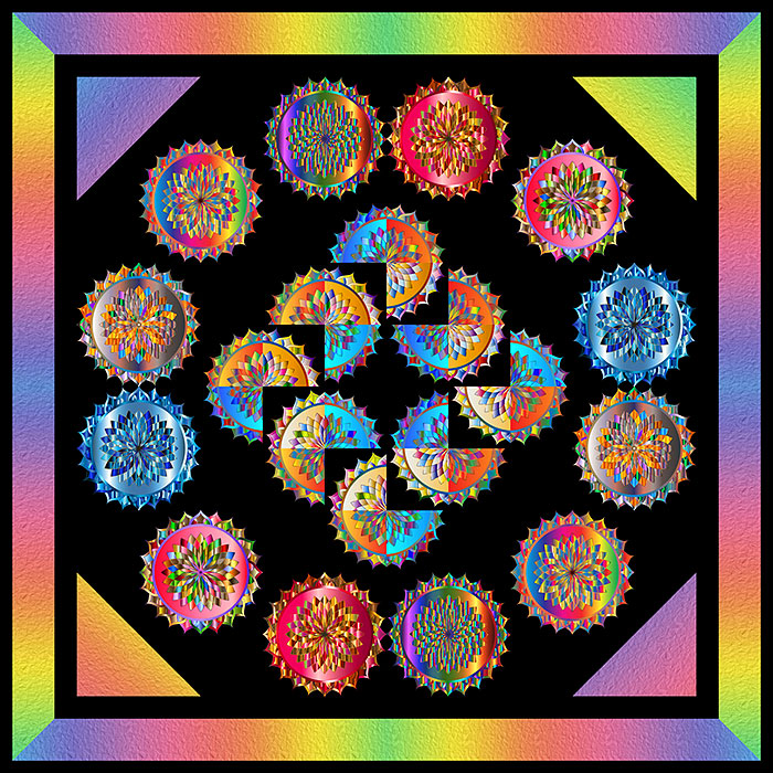 This week’s exclusive eQuilter Free Quilt Pattern tells a tale of smaller Mandalas spinning within a larger Mandala Wheel. The Colors of the Rainbow are a brilliant focus for your meditation room, seeming to float in space on a Black background.
