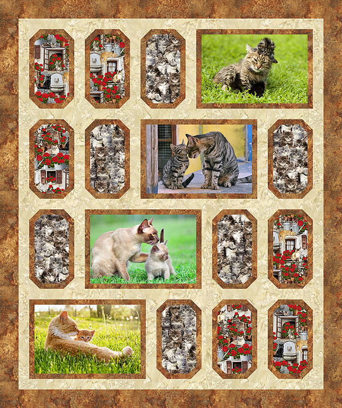 It features our exclusive digital panel with sweet Mother-and-Kitten vignettes, then we added in some more Cat prints, a Stonehenge Gradation and a Hoffman Hand-Dye. This is the gift that keeps on giving… Meow!