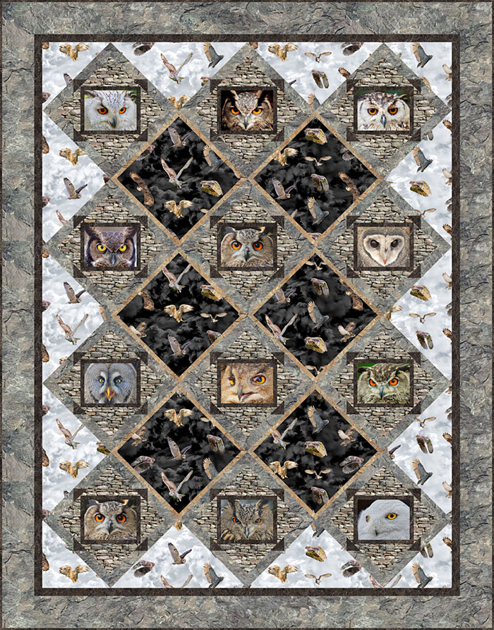 The 61″ x 78″ quilt features a parliament of incredibly detailed owl portraits, peeking through a stone wall, with more owls flying through the air. We’ve used Northcott’s realistic Stonehenge rock textures for the sashing and rock wall…and the result is one of our most popular quilts ever!