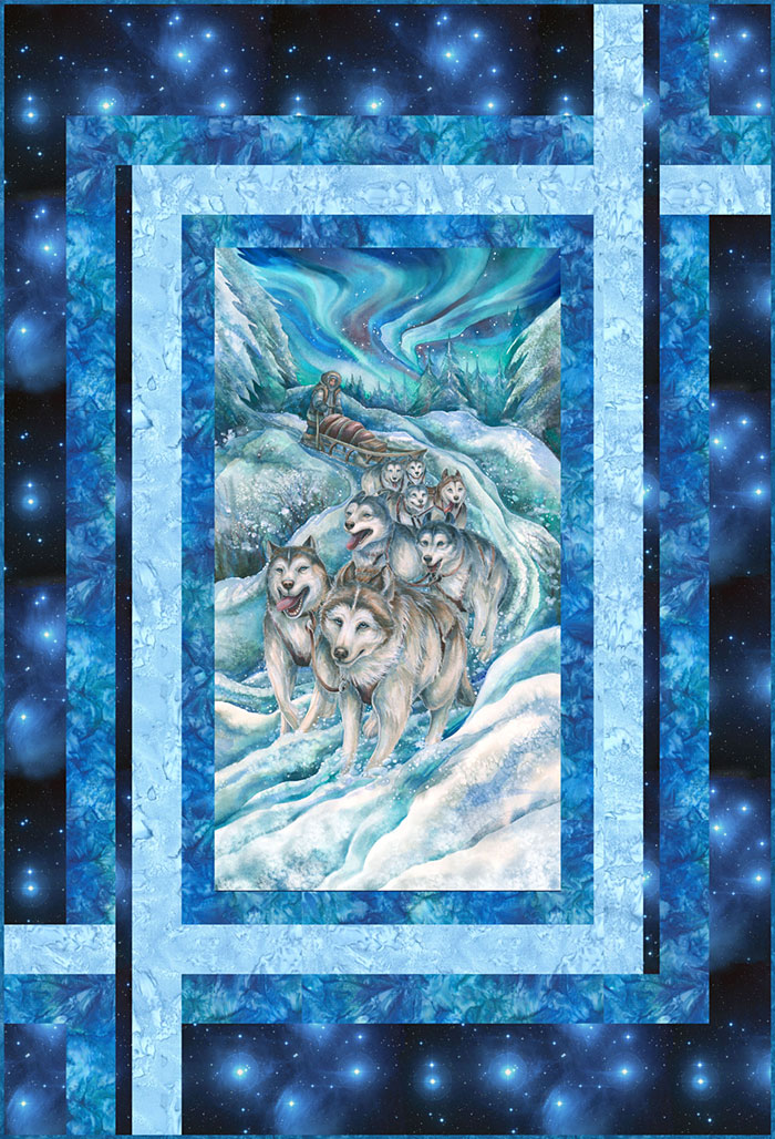 You will see Inuit Sled Dogs, Northern Lights, beautiful coordinating Hand-Dyes, and a Starry Sky border. You’ll hear the vast silence of the tundra, the padding of the dogs’ feet, and the whoosh of the sled on the snowy trail.