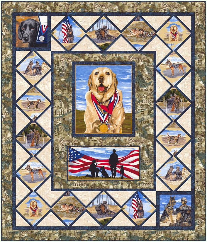 This 58″ x 68″ quilt can be a wall hanging, or lap quilt, and is perfect for a veteran whose unit used these amazing canine companions. Special thanks to Sgt. Charles Shuck, whose heroic Labrador, Gabe was the inspiration for this special fabric.