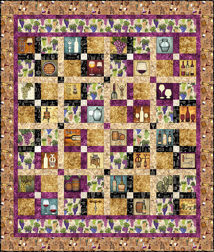 Savor the fine artwork of Dan Morris, in this 51″ x 60″ pieced quilt, featuring beautiful illustrations of wine glasses & bottles, oak barrels & corkscrews, and a variety of grapes.