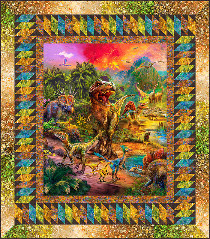 This fantastic Free Quilt Pattern puts a 22″ T Rex in a 36″ digital panel, and then builds a pieced border for a 58″ x 66″ quilt that is guaranteed to spark a conversation with the Dinophiles in the room! Between the exploding volcano, Rex’s teeth, and all the other dinosaurs waiting to be identified in this scenic panel…this quilt is going to delight the Dino-Intellectual in your life.