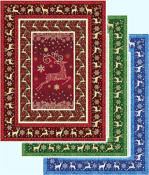 The main panel’s leaping Reindeer is filled with tiny crystalline snowflakes, with more dancing flakes above and below on the selvedge border. The densely layered background has a beautiful texture of tonal jeweltone snowflakes, creating an eye-popping illusion of depth. The border stripe gives this Holiday/Winter wallhanging a cool Nordic feel.