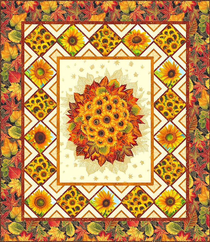 This week’s exclusive eQuilter Free Pattern gathers armloads of Sunflowers and Black-Eyed Susans, hangs them on a garden trellis, and wraps them in sheaves of shimmering copper, gold and green leaves.