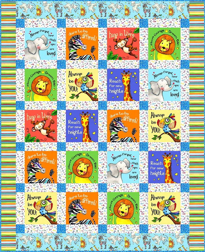 this fun FREE quilt pattern is a great use of a wild animal panel with happy friendly creatures. Each block has a cheerful encouraging message for your little one.