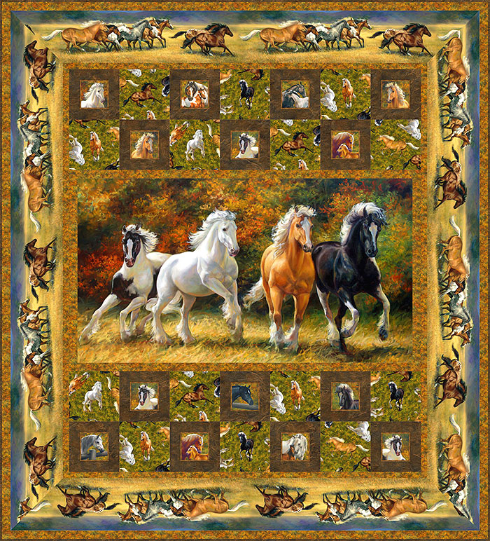 This week’s exclusive eQuilter Free Quilt Pattern features this exceptionally detailed Digital-printed central panel with gorgeous horses running wild and free.