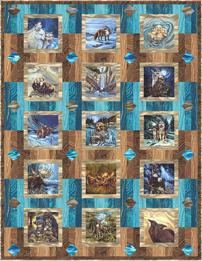 In this 62″ x 80″ quilt design, Jody’s artwork manages to capture the beauty and details of otters, bears, moose, eagles, wolves, ravens, bison, puffins, raccoons, fox, owls, and the gorgeous mountains, forest and rivers in which they live!