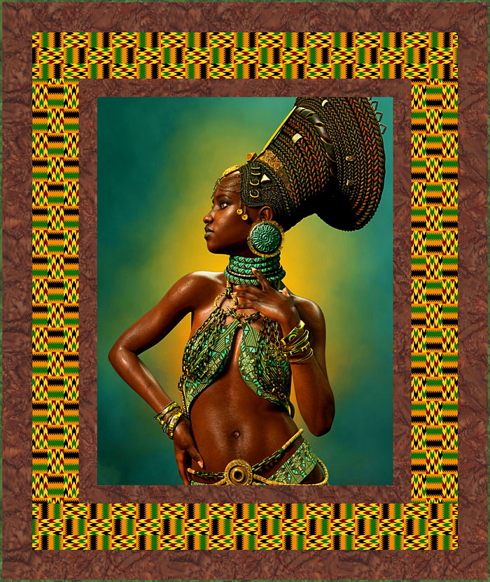 To make this 53″ x 63″ quilt design, you will start with the opulent 34″ x 44″ central portrait panel. We’ve set it in a frame of coordinating African Kente-inspired geometric, and a rich Mahogany Hoffman hand dye.