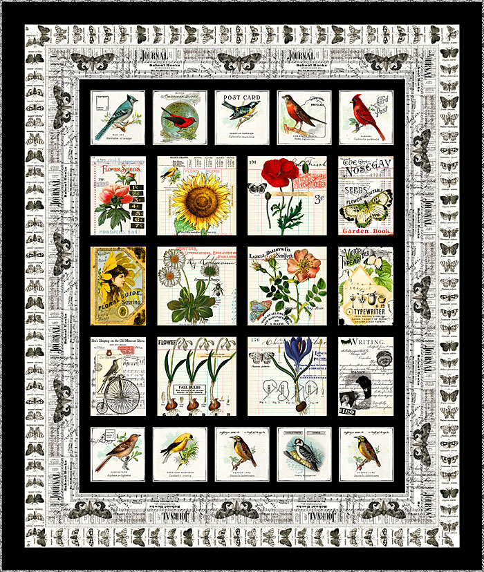 We have just restocked the popular “Art Journal” collection by Janet Frisch, who creates unique vintage-flavored collections, reminding us of our grandmother’s scrapbooks. This striking quilt has an eclectic mix of illustrative styles, which has become the hallmark of J. Wecker Frisch’s work, and the foundation of her worldwide fan base.