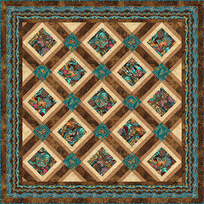 | Colorful butterflies inspired by the Australian outback, are the focus of this week’s exclusive Free Quilt Pattern, blending the colors of sky and water, with colors of earth and stone. To make this 62″ x 62″ patchwork quilt design, we’ve combined 4 multi-color prints with 2 tonal prints and a Hoffman hand-dye, to make this Teal and Sepia color story. …from the ‘Pannotia’ collection by Oasis Fabrics. PLUS – you’ll receive Free USA / 50% off INTL shipping when you order the fabrics for this rather eccentric quilt pattern (orders $100 and over, no coupon needed). Don’t miss the ‘Spirits Of The Wind‘ and ‘Steampunk Express‘ quilt patterns! Order the pattern as configured, or customize it to your liking with any of our thousands of fabrics. Just place your desired fabrics in your Wish List, and these fabrics will appear in the Fabric Selector below the pattern. Click Here for a Video Tutorial of the Free Pattern Designer. Download Instructions for the pattern at the bottom of the pattern designer page. Luana and Paul Rubin |