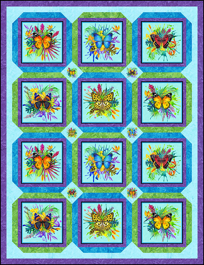 To make this 63″ x 82″ quilt design, you will use a panel and a large allover digital print from our exclusive Rubin Design Studio. Add in 4 Hoffman Hand-Dyes and Kaufman Solid Kona Black to frame this stunning collection of framed butterfly vignettes.
