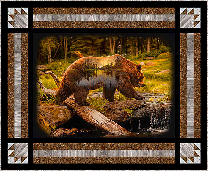 Travel to the back country of Northern forests with this week’s Free Quilt Pattern, with a scenic panel featuring a landscape-within-a-landscape and a Brown Bear on the move.
