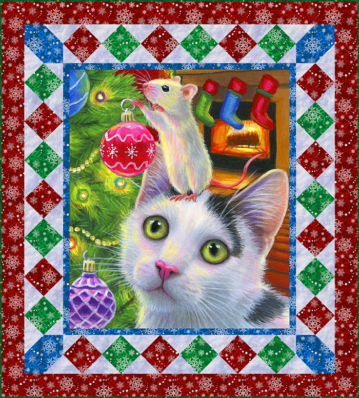 | Today’s eQuilter Free Quilt Pattern features adorable kitty and mouse friends decorating their Christmas Tree, awaiting Santa to fill their stockings! To make this 54″ x 60″ quilt design, you will start with the central 36″ x 44″ scenic panel which will delight you with all the charming Christmas details. Add our exclusive snowflake & star prints in red, green and blue along with our frosty snow background, for this adorable and festive quilt, just in time for the Holidays! …from the ‘Cherished Animals’ collection by Bridget Voth for David Textiles. PLUS – you’ll receive Free USA / 50% off INTL shipping when you order the fabrics for this rather eccentric quilt pattern (orders $100 and over, no coupon needed). Don’t miss the ‘Color Play‘ and ‘Kitty Tea by the Sea‘ quilt patterns! Order the pattern as configured, or customize it to your liking with any of our thousands of fabrics. Just place your desired fabrics in your Wish List, and these fabrics will appear in the Fabric Selector below the pattern. Click Here for a Video Tutorial of the Free Pattern Designer. Download Instructions for the pattern at the bottom of the pattern designer page. Luana and Paul Rubin |