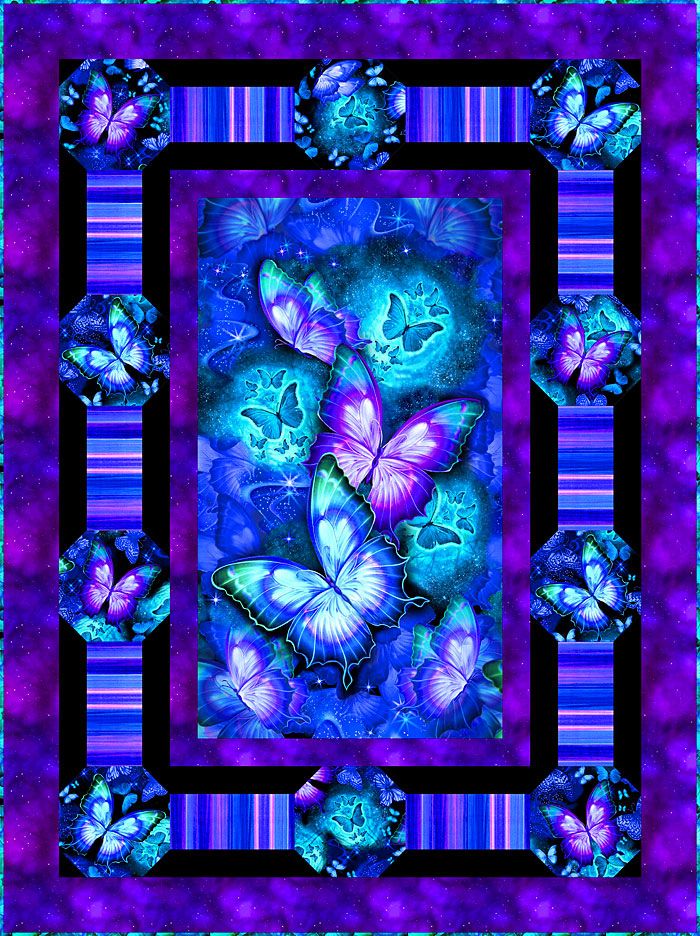 To make this 51″ x 68″ quilt design, you will start with the 24″ x 44″ Luminescent Butterfly panel, then add borders from the purple nebula starfield print, allover Night Sky Butterfly, coordinating Midnight stripes and dramatic solid black.