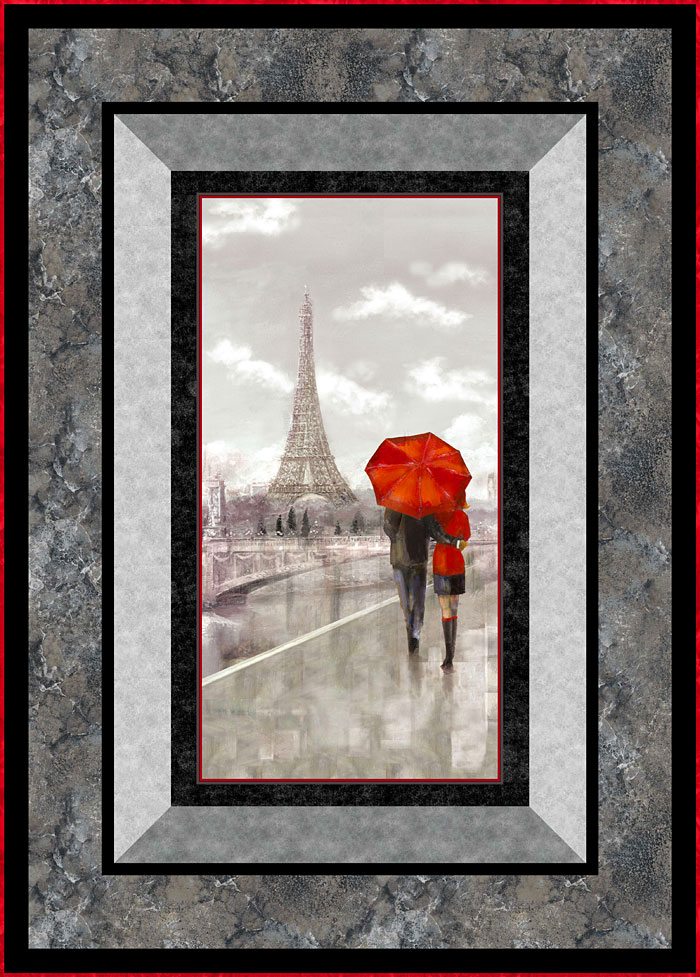 To make this 43″ x 60″ framed quilt design, you will start with the 24″ x 44″ scenic panel. We love the pop of RED against the neutral shades of gray in the background scene, featuring the Eiffel Tower on a rainy day. We’ve added 3 Stonehenge textures, Kona Solid Black and a Red Hoffman Hand-Dye to create a dimensional frame around this romantic image.