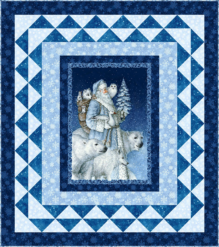To make this week’s 49″ x 55″ Free Quilt Pattern, you will start with the 24″ x 44″ digital printed central panel. Then cut and piece the border, imitating snowy peaks, with snow-themed coordinates.
