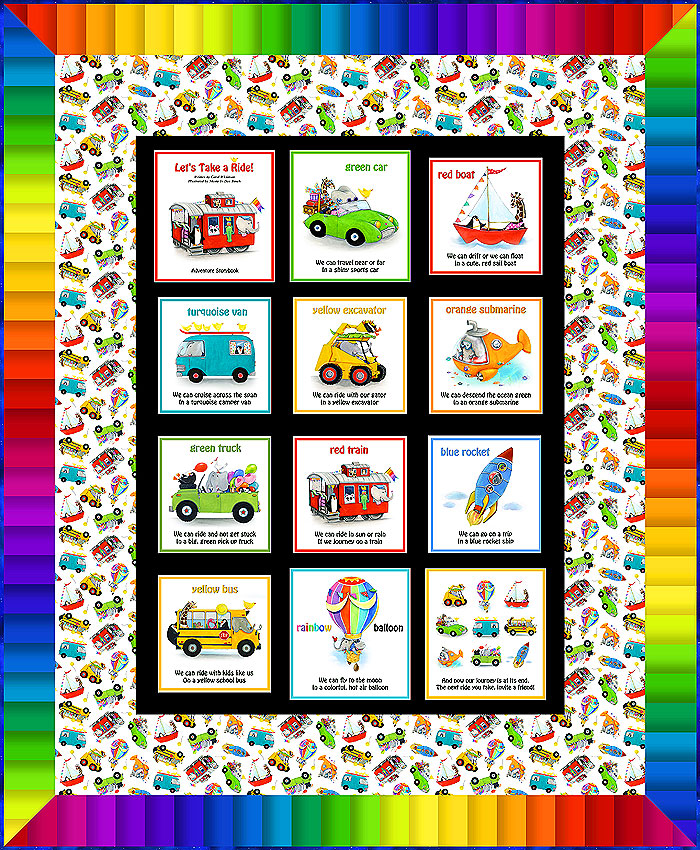 Make this 48″ x 58″ quilt as a Crib Quilt, or for the most fantastic Play Mat! Your favorite little person will find a Red Caboose, a Green sports car & Jeep, a Yellow Bulldozer & School bus, a Turquoise Van, an Orange Submarine, a Blue Rocket ship, a Red Sailboat & a Rainbow Hot Air Balloon to capture their attention on each ‘page’ of this Soft Book which has been cleverly turned into a child’s play quilt!