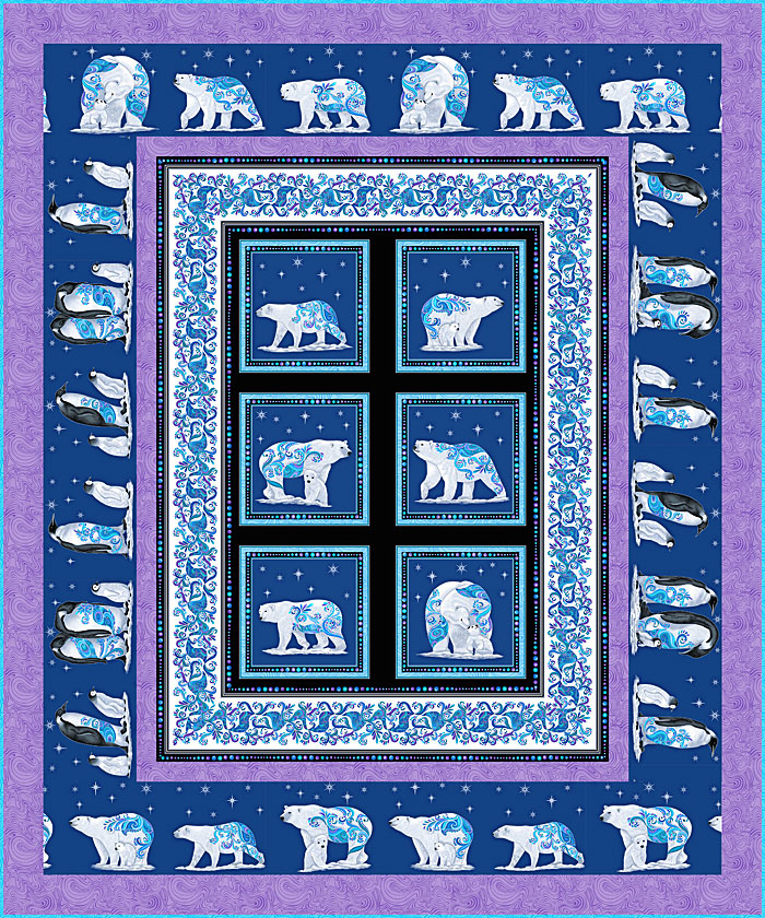 To make this 58″ x 69″ quilt design, start by pressing the 24″ x 44″ panel, glistening with Pearlescent accents. You will build the border with more embellished swirls, coordinating blenders, and the alternating Penguin and Polar Bear frame.