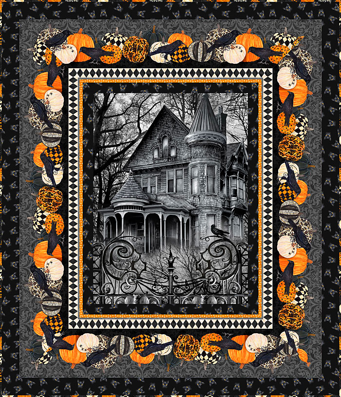 | Take a trip to this spooky Victorian mansion, in tonight’s exclusive eQuilter Free Quilt Pattern. Open the creepy wrought iron fence, and allow the conspiracy of Ravens to escort you into this haunted house….IF YOU DARE! To make this 49″ x 57″ quilt design, you will start with the central 24″ x 44″ panel depicting the crumbling architecture of faded grandeur. Add the graphic Raven & Pumpkin stripe, and the Disembodied Black Cat Heads to make the border. This is a quick and easy project that is sure to scare the jeebers out of your neighborhood Trick-or-Treaters. BOO! …from the ‘Candelabra’ collection by Northcott Fabrics & the ‘Wicked Eve’ collection by Timeless Treasures. Don’t miss the ‘Halloween Spirit‘ and ‘Soaring Eagle‘ quilt patterns! Your Free Quilt Pattern – Raven Manor Order the pattern as configured, or customize it to your liking with any of our thousands of fabrics. Just place your desired fabrics in your Wish List, and these fabrics will appear in the Fabric Selector below the pattern. Click Here for a Video Tutorial of the Free Pattern Designer. Download Instructions for the pattern at the bottom of the pattern designer page. Luana and Paul Rubin |