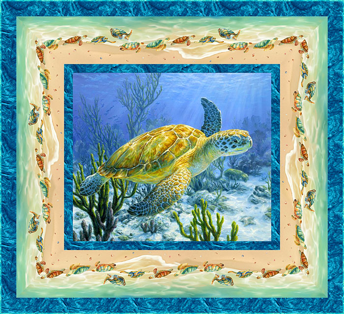 | Back in Stock – by popular demand! This endangered Sea Turtle is gliding peacefully through sun-dappled waters, to remind us of how precious clean water is to all living things. #WaterIsLife If you’ve been lucky enough to have an encounter with one of these gentle creatures, when snorkeling or beach-combing, you know that they have a special presence and seem to emanate an ancient wisdom. Indeed, some indigenous cultures’ creation stories have the world riding on the back of a Sea Turtle. To make this 69″ x 63″ Nature-themed quilt, you will start with the 35″ x 44″ underwater scenic panel. Use our exclusive “Turtles on the Beach” stripe to create the border. This quilt brings a dreamy vibe to a room, as a wall-hanging. As a Nap/Lap quilt, you’ll be gliding through tropical waters in your sweet dreams as you sleep under this quilt. …from the ‘Sea Turtle’ collection by David Textiles and Rubin Design Studio. PLUS – you’ll receive Free USA / 50% off INTL shipping when you order the fabrics for this rather eccentric quilt pattern (orders $100 and over, no coupon needed). Don’t miss the ‘Spirits Of The Wind‘ and ‘Aurora Polaris‘ quilt patterns! Order the pattern as configured, or customize it to your liking with any of our thousands of fabrics. Just place your desired fabrics in your Wish List, and these fabrics will appear in the Fabric Selector below the pattern. Click Here for a Video Tutorial of the Free Pattern Designer. Download Instructions for the pattern at the bottom of the pattern designer page. Luana and Paul Rubin |