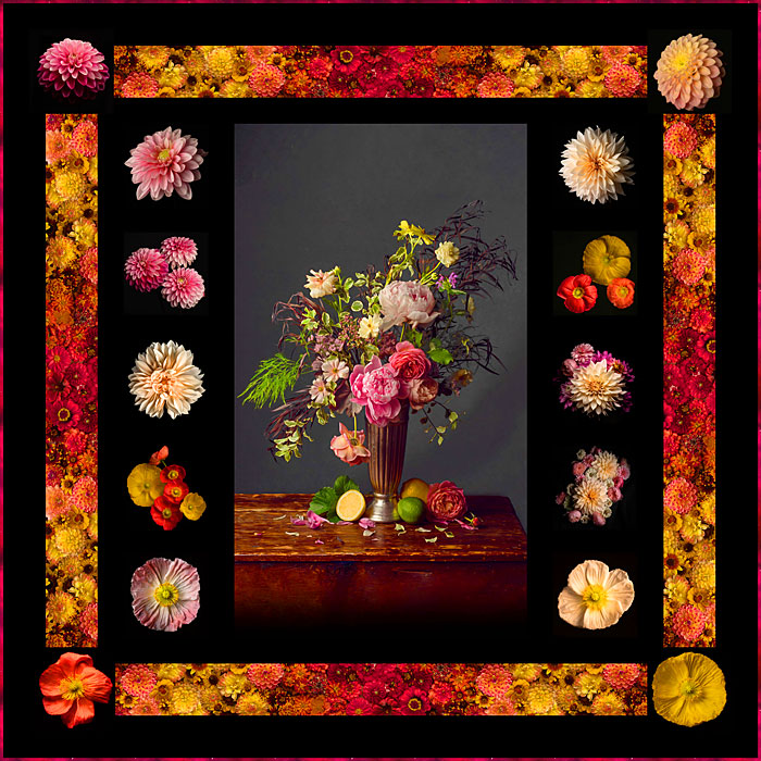 To make this 59″ x 59″ masterpiece, you’ll start with the main 24″ floral vase panel, and accent with coordinating floral blocks & Garden Gems double border print. The solid black background adds to the romantic feel, creating an overall picture of ‘Shadow and Elegance’.