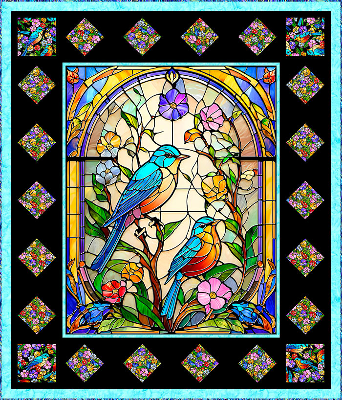 To make this 54″ x 63″ quilt design, you will start with the magnificent 36″ x 44″ stained glass bird panel, then piece the diamond and square blocks with sunny coordinates, which pop out against the solid black background. A cyan blue Hoffman Hand-Dye frames the panel and provides a brilliant outer border.