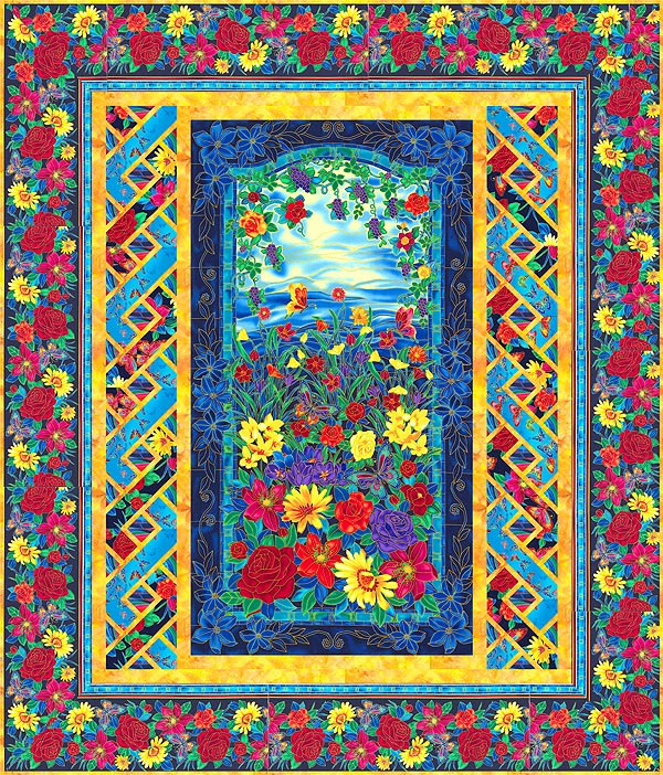 In this rich jeweltone quilt with opulent gold metallic details, we gaze out through a lattice window, to the flower garden beyond… a scenic slice of paradise!