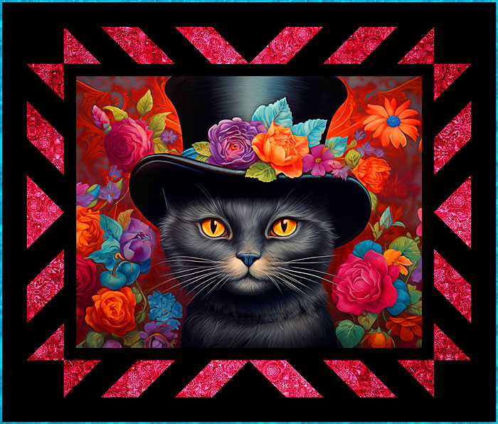 This delightful Victorian Kitty gazes directly at you with golden eyes, and garlands of lush flowers on a silk top hat. This week’s exclusive Free Quilt Design is full of beautiful details and a cat with lots of personality! You will appreciate the fine brushwork and whisker minutiae in this captivating piece of feline portraiture.