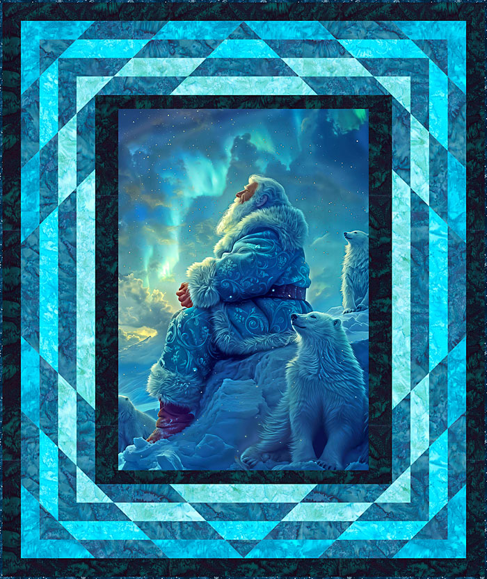 To make this 55″ x 63″ quilt pattern, you’ll begin with our best-selling ‘Aurora Santa’ panel. Then add 5 watery shades of blue-aqua Hoffman Hand-Dyes to piece the borders.