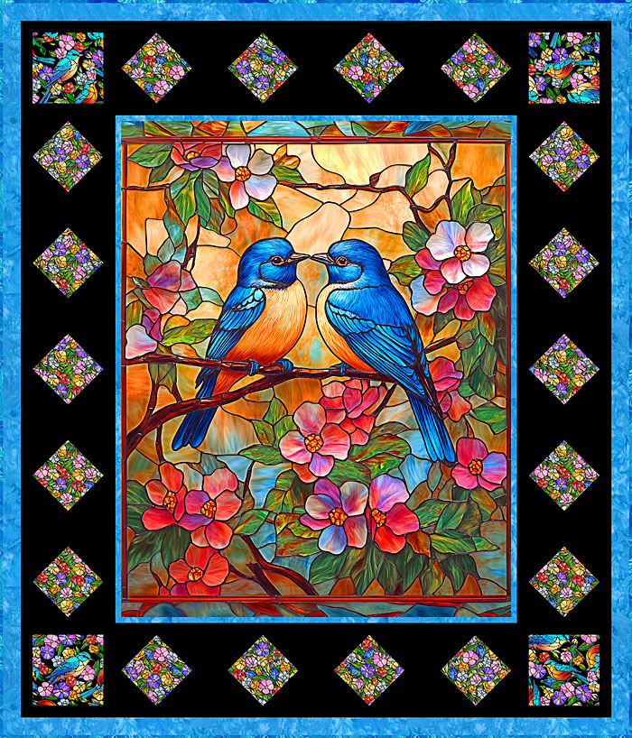 To make this 54″ x 63″ quilt design, you will start with the magnificent 37″ x 44″ stained glass bird panel, then piece the diamond and square blocks with sunny coordinates, which pop out against the solid black background. A blue Hoffman Hand-Dye frames the panel and provides a coordinating outer border.