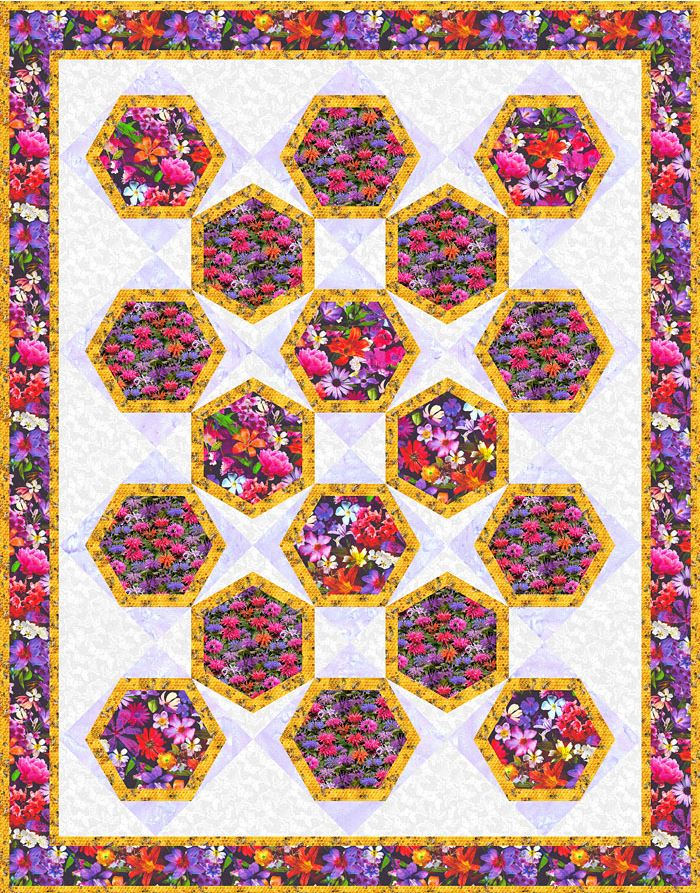 This generous 59″ x 72″ quilt celebrates abundance with bejeweled floral hexagons, bordered by sweet, nectar-colored honeycombs, set against a white tonal ground.