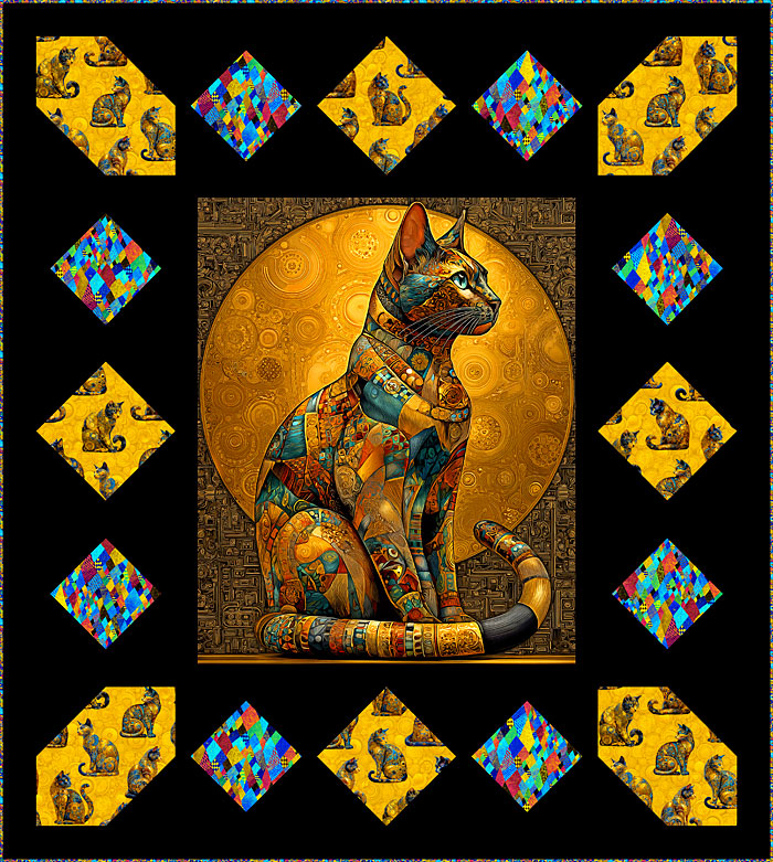 To make this dazzling 70″ x 78″ Cat-themed quilt design, you will start with the 37″ x 44″ panel. Piece the borders with the Klimt Kitty allover and gilded crazy quilt print, all boldly set within Solid Black. This quilt is an awesome conversation piece for the serious Cat-Lover!