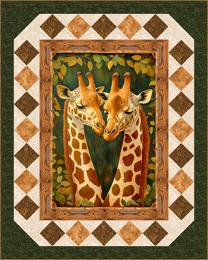 Plus we offer a Free exclusive 57″ x 71″ quilt design! Start with our Giraffes in Love panel, border with our natural hardwood print, then piece the blocks and outside border with coordinating tonals and Hoffman hand dyes.