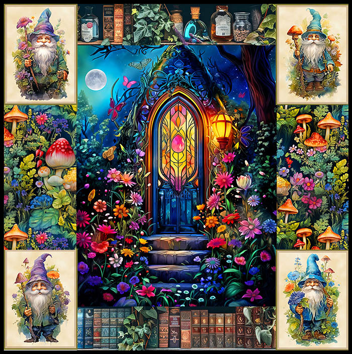 We have a whole group of fans who are making One Block Wonder quilts from our Animal Portrait Panels, and now another group is playing around with our Mushroom prints. Personally I just adore our Gnomes who each have a different personality. Add the magical glowing house in the woods under a Full Moon….and this is a place I’d like to escape to in my dreams!