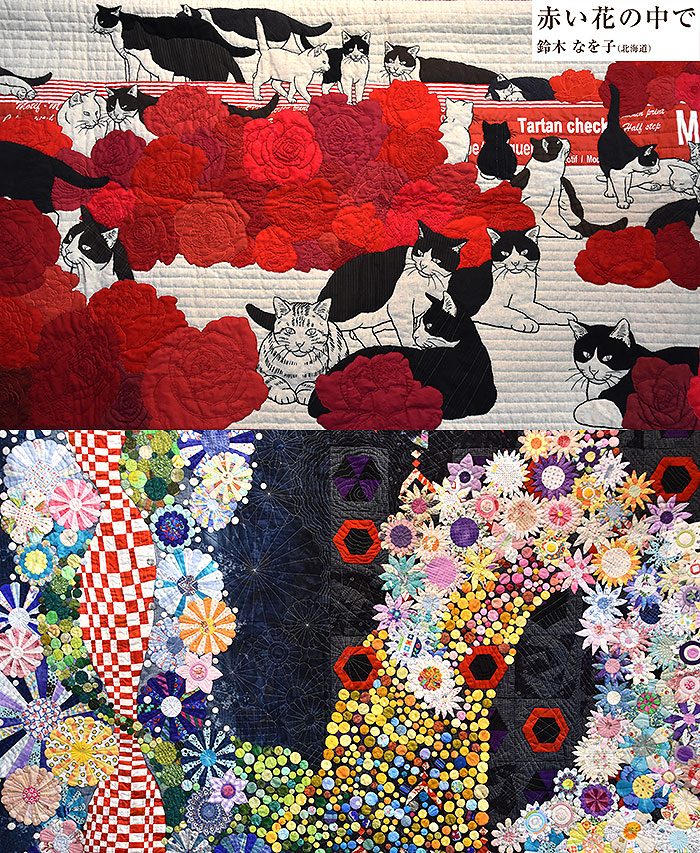 The Cat quilt with Roses is by Naoko Suzuki. The swirling detailed quilt below (that looks like the creation of the world) is “Endless Love” by Kazuko Fujimura. Put them together and you have an expression of the endless adoration we feel for our cats.